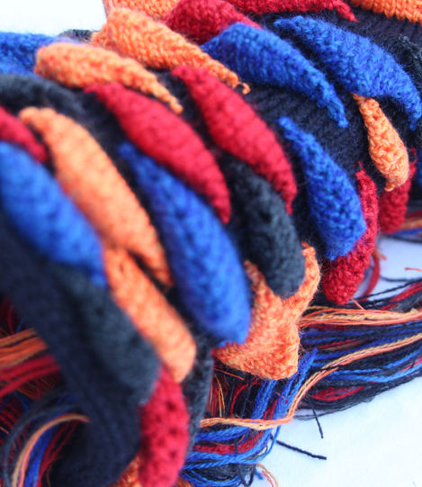 Another piece I designed was a lifejacket that was made up of four vests all knitted as one long continuous segment, each part unique and constructed with a different technique. It can be worn either as a massive bulky vest, comparable to a life jacket, or by multiple people wearing it together, one article of clothing that connects everyone wearing it.